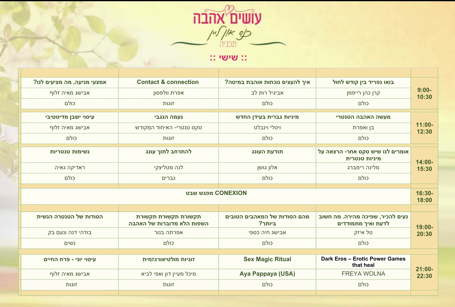 אבישג מאיה זלוף ומיכאל פינקל מזמינים אתכם ל 3 ימים עם מעל ל 40 הרצאות וסדנאות עם טובי המנחים מהארץ ומחו"ל שמוקדשים למעשה האהבה.
