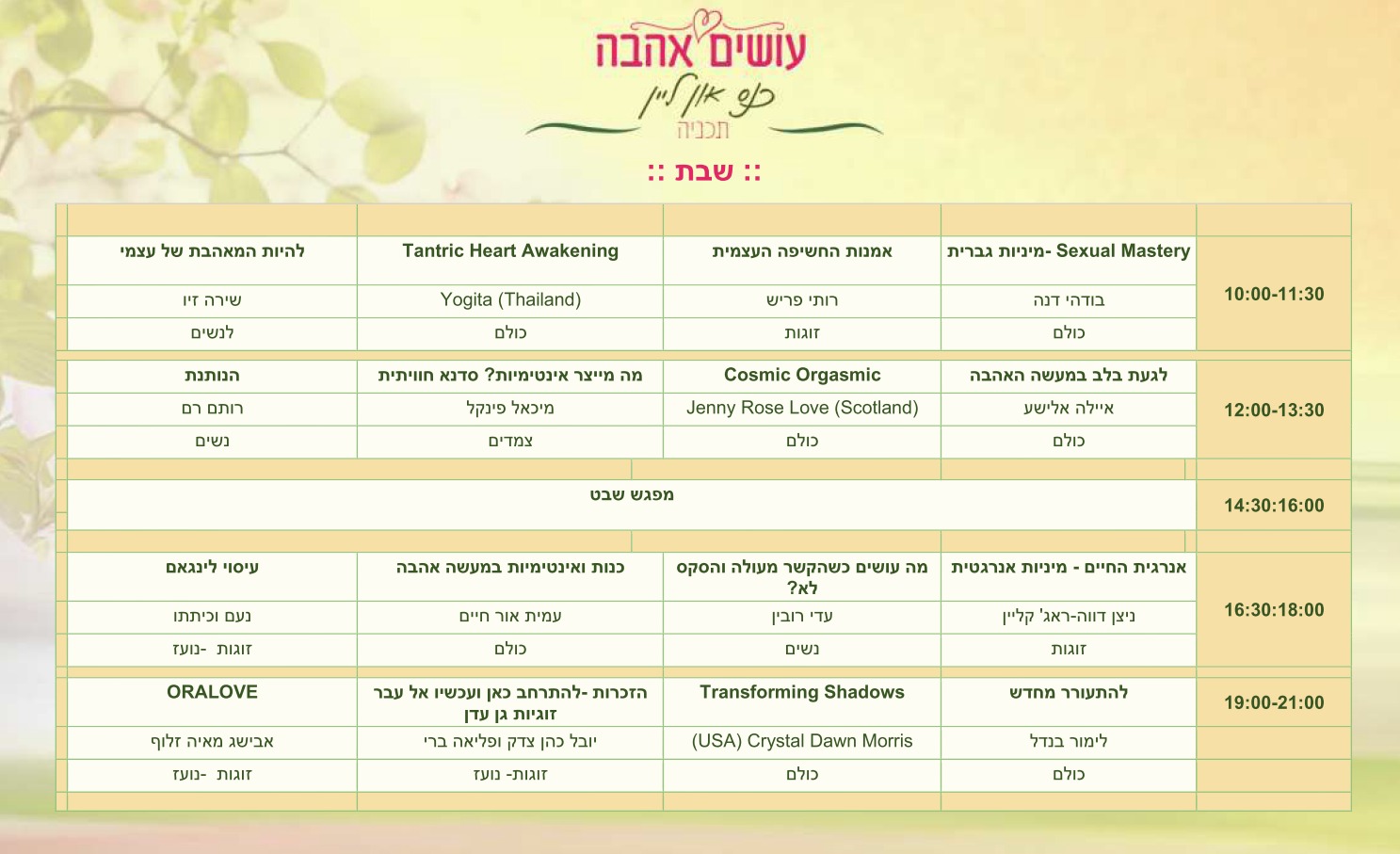- נכיר את המיניות המודעת והמיניות המקודשת כדרך להתחבר אל החלקים הגבוהים והעמוקים של ההוויה שלנו ושל בנות הזוג שלנו, ועוד.